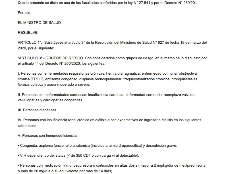 En ese sentido, “corresponde sustituir el artículo 3° de la Resolución N° 627/2020, procediendo a incorporar las personas con obesidad dentro de los grupos de riesgo definidos en la referida Resolución”.