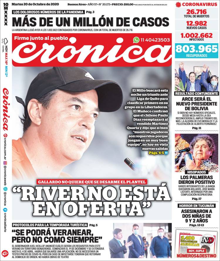 Inicio País Tapas de diarios argentinos de hoy martes 20 de octubre de 2020. PaísSin categoría Tapas de diarios argentinos de hoy martes 20 de octubre de 2020. 20 octubre, 2020 FacebookTwitterPinterestWhatsApp Artículos relacionadosMás del autor Sin categoría Sin categoría De lo que hablan todos - Advertisement - Recent Posts De lo que hablan todos 9 abril, 2026 0 Sin categoría 9 abril, 2026 0 De lo que hablan todos 9 abril, 2026 0 De lo que hablan todos 9 abril, 2026 0