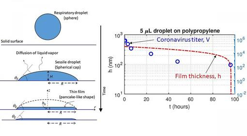 «Nuestro modelo muestra que la supervivencia y el tiempo de secado de estas gotas coinciden con mediciones anteriores de supervivencia mínima del SARS-CoV-2 sobre distintos tipos de materiales», Agrawal refiriéndose a la dosis mínima de virus que una gota debe contener para poder infectar. En los experimentos, se comprobó que en el cobre, el coronavirus puede sobrevivir de 10 a 15 horas activo; en acero inoxidable permanece entre 40 y 60 horas; en vidrio alcanza entre 60 y 80 horas; y el máximo se produce en el plástico, en el que aguanta de 100 a 150 horas.