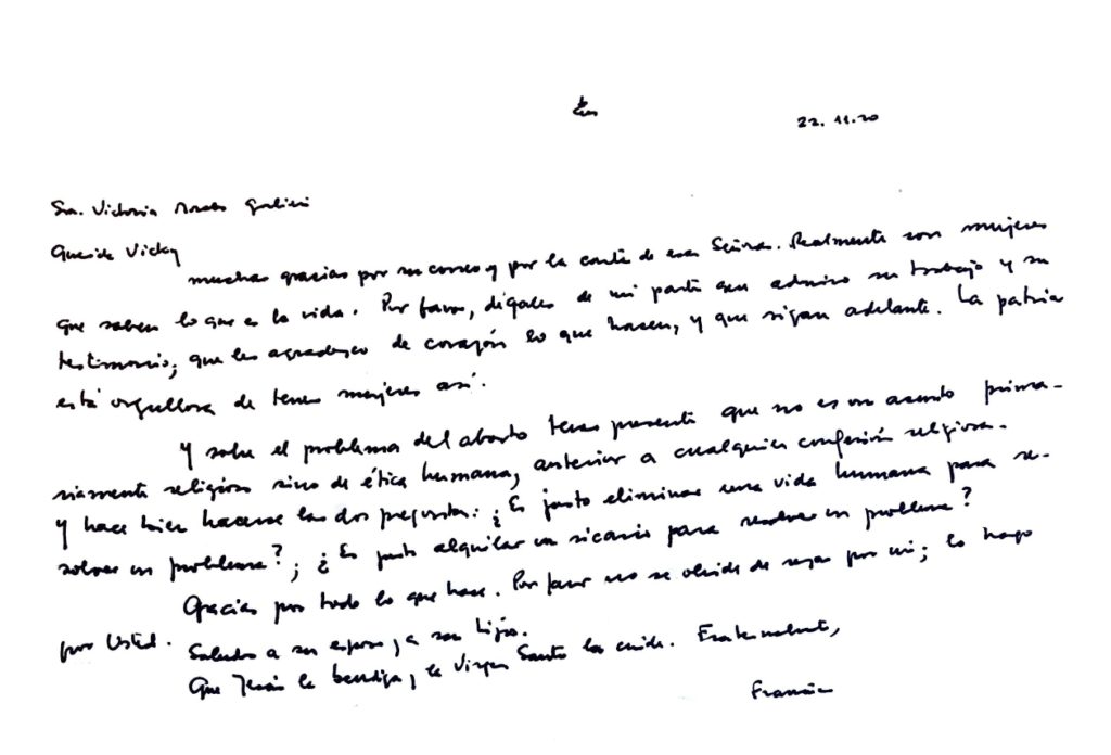 “Muchas gracias por su correo y por la carta de las señoras”, expresó el Papa en una carta manuscrita que hizo llegar a través de la diputada nacional Victoria Morales Gorleri (Pro), con la que el sumo pontífice cumplió el pedido de las mujeres para interceder en el debate.