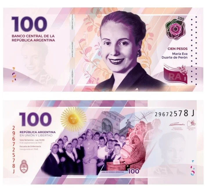 $100. María Eva Duarte de Perón Fue impulsora de la Ley 13.010 de sufragio femenino de 1947 y una figura de enorme trascendencia en la lucha por la ampliación de derechos sociales y laborales en nuestro país y un referente a nivel internacional. Fundó el Partido Peronista Femenino y través de la Fundación Eva Perón canalizó ayuda social hasta su fallecimiento de forma prematura en 1952. Fue una defensora de los derechos sociales y laborales, promotora de medidas a favor de la igualdad de la mujer y de una mayor inclusión en beneficio de los sectores más postergados.